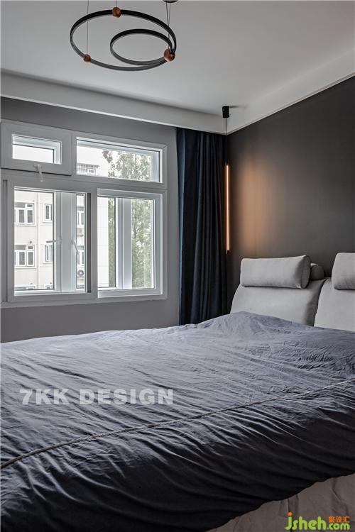 卧室白色吊顶,深灰色床头背景墙,简约的色调搭配舒适安逸,宁静温馨的睡眠环境。