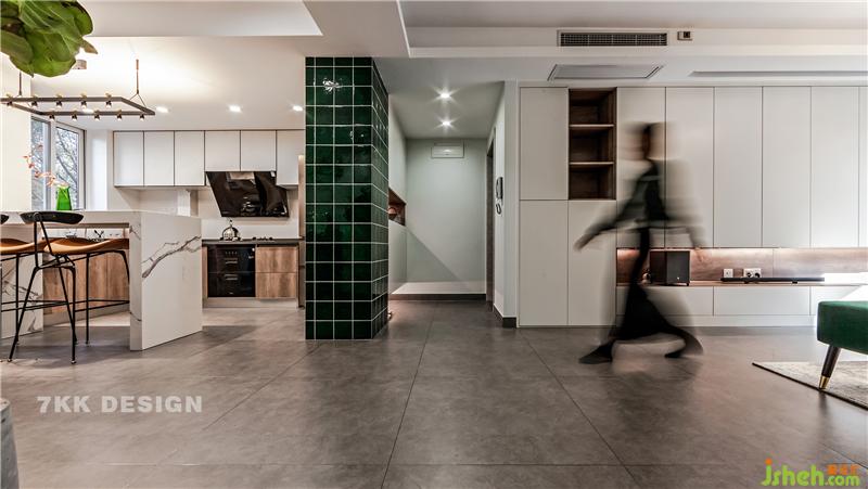 因为平时业主一家三口在吧台上就可以解决三餐问题,如果有客人来,上海装修设计暗藏在客厅定制柜里面的折叠餐桌就可以派上用场,放在过道中间,尺寸都是预留好的哦。
