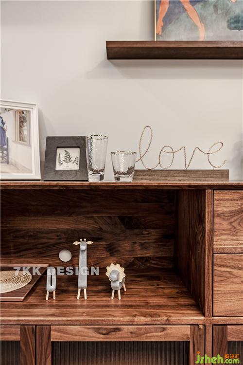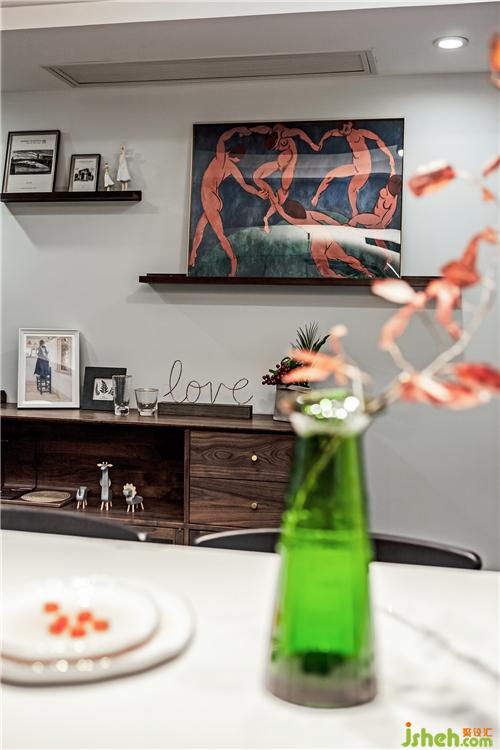 成品的餐边柜里面暂时摆放的业主收藏的小饰品。上方的装饰画和玻璃杯也是设计师自己带来给业主搭配的哦。