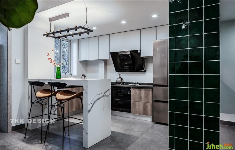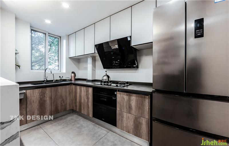 厨房L型的操作台面。上下的橱柜设计,增加更多的厨房收纳空间。厨房台面一侧是成品冰箱。