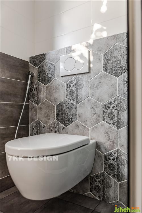 马桶间,墙面选择几何形复古纹理的瓷砖+白色瓷砖拼接,时尚复古,干净清爽。