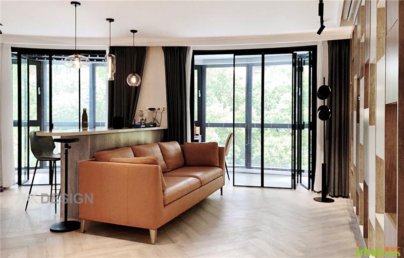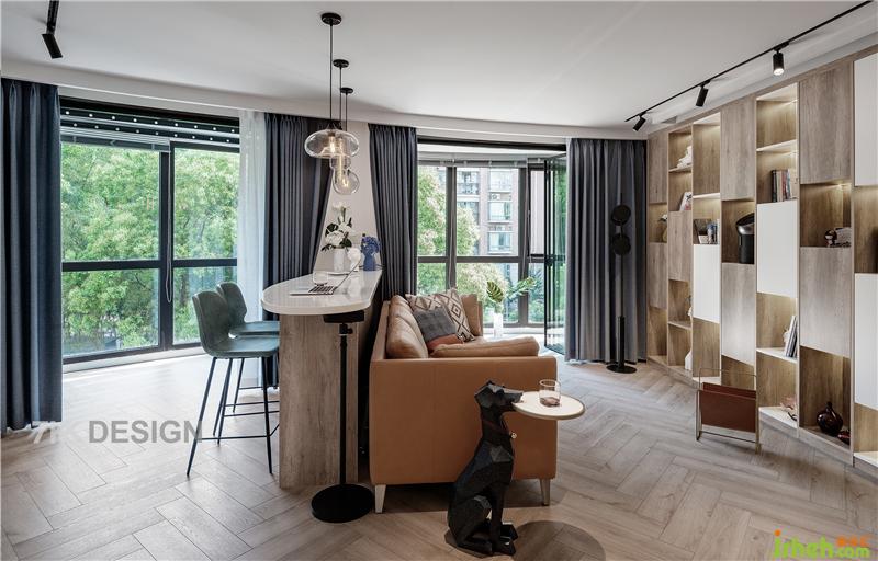 1、为使得原始不规则的客厅有个比较方正的空间,利用阳台中间的承重墙作为分隔,和客厅电视背景墙齐平定制一排吧台,吧台一侧不规则弧形元素更具设计感上海室内设计师。 沙发背靠吧台摆放,电视背景墙定制一整面到顶的书架。因为业主很少看电视,在书架顶部内藏投影幕布,平时看电影时可以放下来使用。这样吧台作为隔断使得客厅空间一份为二,动线更流畅。
