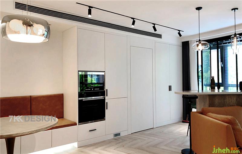 隐形门左边是定制电器柜内嵌烤箱、蒸箱、冰箱,隐形门右侧是定制收纳柜使用。
