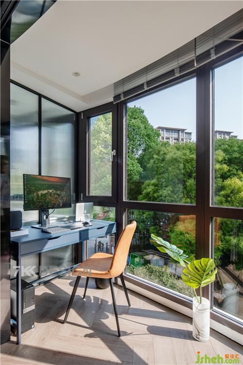 客厅阳台一侧作为书房使用,阳台另一侧是晾晒洗衣空间。阳光洒进来,光和影塑造一副时光静好的画面。去拍摄时业主刚好在这里度过他美好的下午时光,打游戏中。在公办时如果光线很强可以放下百叶窗,视觉效果也很赞。平时晚上男业主在这办公也不会打扰到女业主休息。
