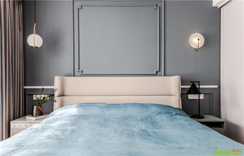 主卧床头背景墙色调与客厅沙发背景墙相呼应,石膏板线条丰富墙面立体感。