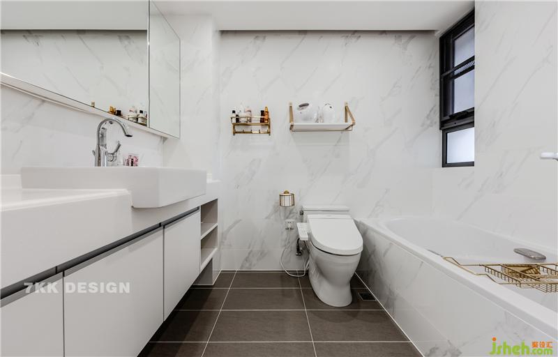 次卫L型,台盆柜+马桶+淋浴房。也是白色为主,镜框+装饰架金属元素点缀,营造精致清爽的卫生环境。