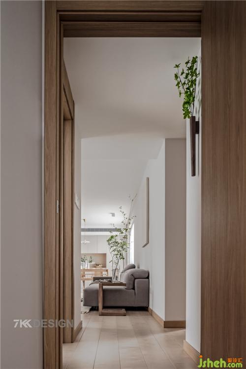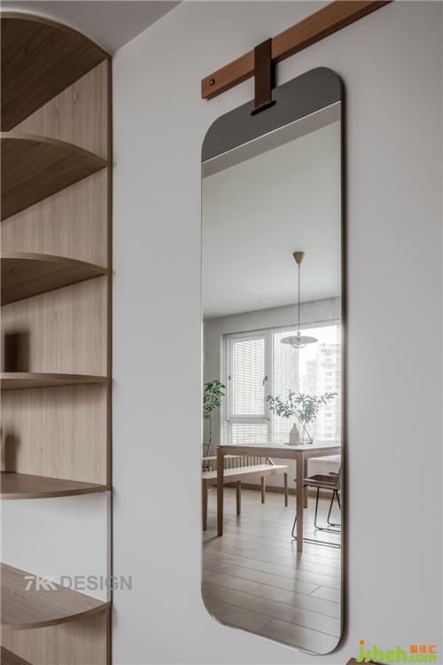 进门处右侧设置简易玄关,原木色的换鞋柜+换鞋凳,简单又实用。方便家里老人,小孩出入换鞋,即安全,又舒适。墙面放置一面穿衣镜+简易挂钩,进出门前整理衣物、放置包包,每天都仪式感满满的。