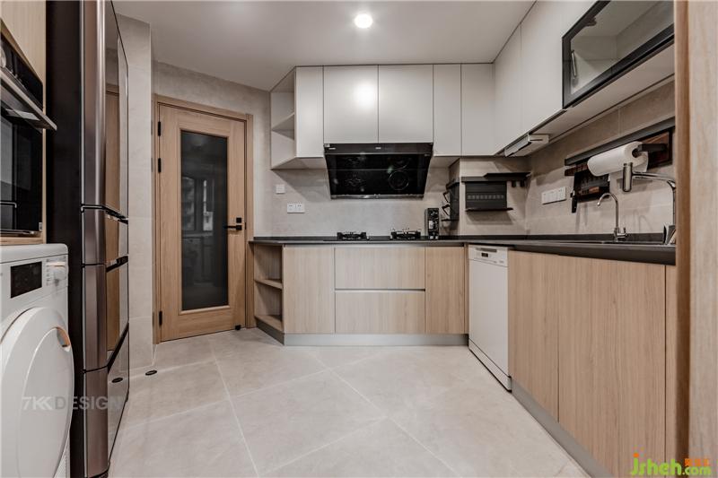 L型的厨房设计让烹饪变成了一件很幸福的事情,流畅的操作动线、嵌入式家电让厨房功能实现最大化。原木、黑、白配色更显温馨自然,也让厨房工作更有条理。