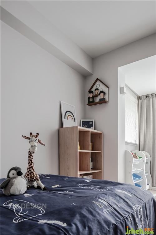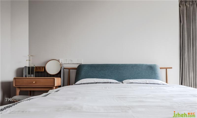 主卧以灰色调为参考来布置,大面积的白灰木色作为基调,使其成为让人放松的休憩空间;自然简约的梳妆台和精致的茶几,点缀其中的蓝色床头,让主卧从单调乏味中跳出来,很好地展现业主的有趣的个性和生活品味。