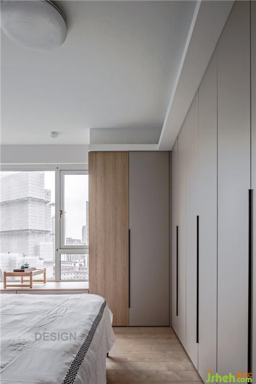 业主要求有很大的储物空间,上海室内设计师合理规划了主卧空间,增加一墙定制衣柜,满足业主的储物需求。