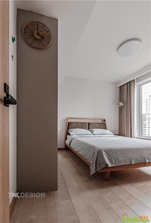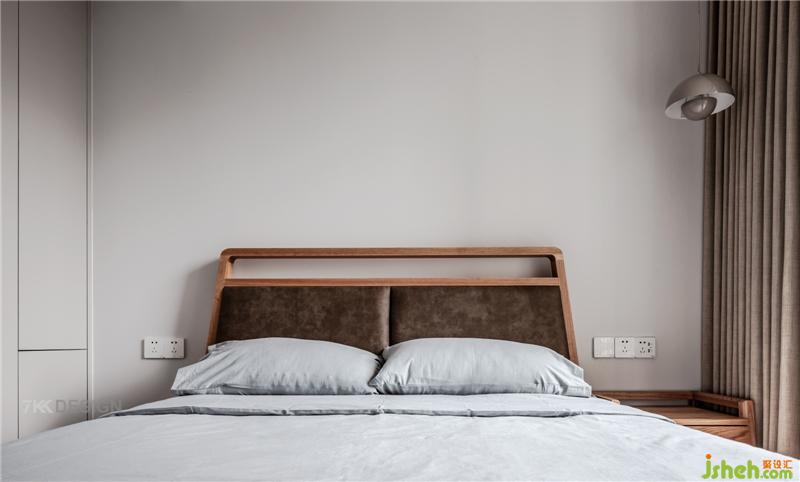 次卧简简单单的,没有过多的装饰。浅灰色的床品搭配木地板,使得空间非常有质感,垂下的吊灯也使整个空间更加个性。