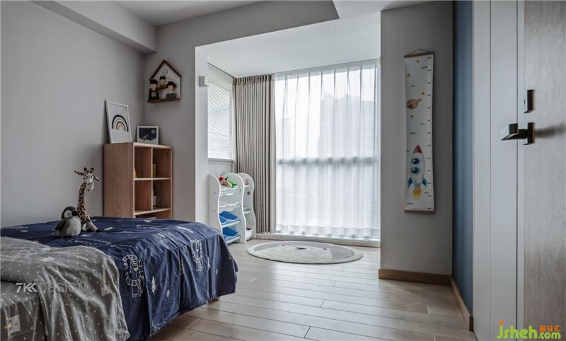 由于居住时间较长,设计为小朋友的成长需求预留出足够的改变空间,现阶段儿童房充满童趣感,蓝色的儿童床品与白灰色墙形成鲜明的对比,富有层次感。