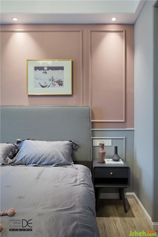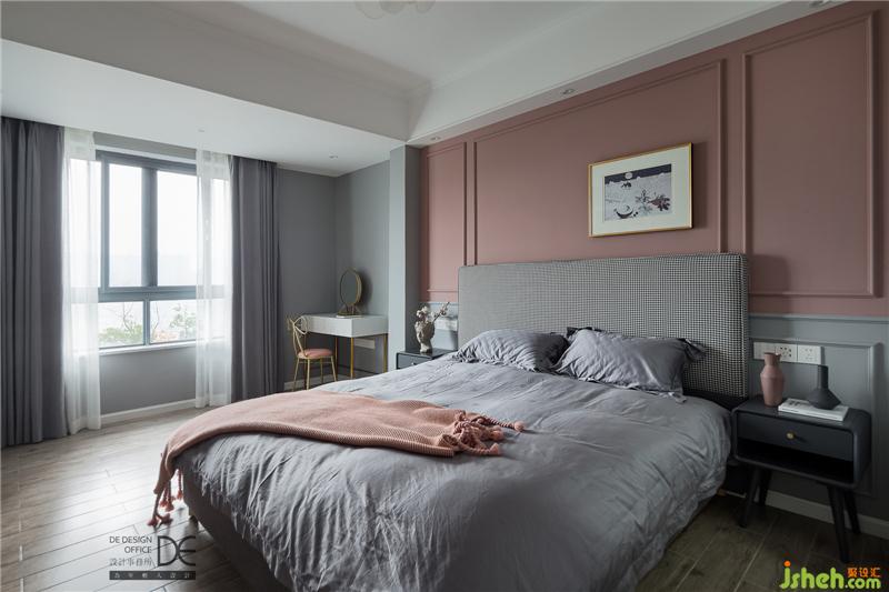 主卧的原木色木纹砖搭配灰色+脏粉色的背景墙,营造了一个温馨舒适的睡眠空间。将原本的阳台纳入室内,不仅增加了卧室面积,更是引入了更多的光线,让卧室变得更加柔和清透。