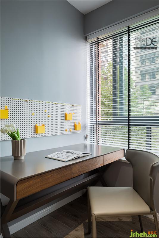 这个多功能空间可以根据需要切换,常见的形态是书房,必要时还可以将沙发展开变成床。为了将采光效果做到最佳,窗帘均采用了木百叶。