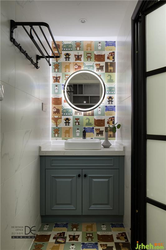 选砖时,业主夫妇便对这款卡通砖“一见钟情”,可爱的卡通砖搭配圆镜,让卫生间更显俏皮。不管是客厅的电视墙、小猴边几,餐厅的灯具、装饰画,还是厨房的花砖、卫生间的卡通砖……这些奇趣元素的点缀,让这个温馨之家妙趣横生。