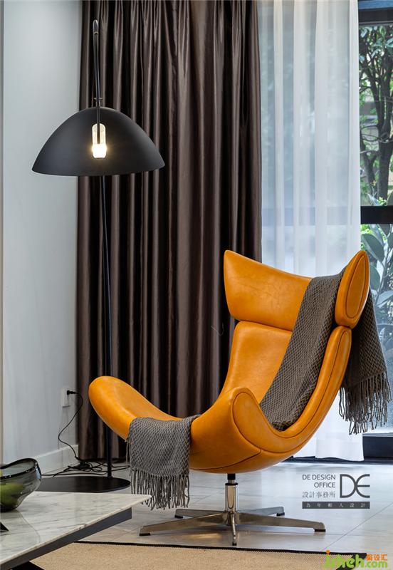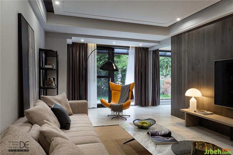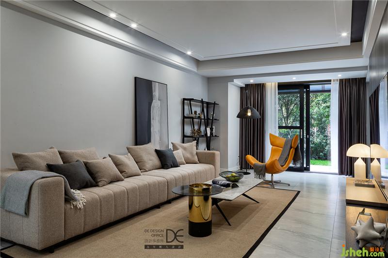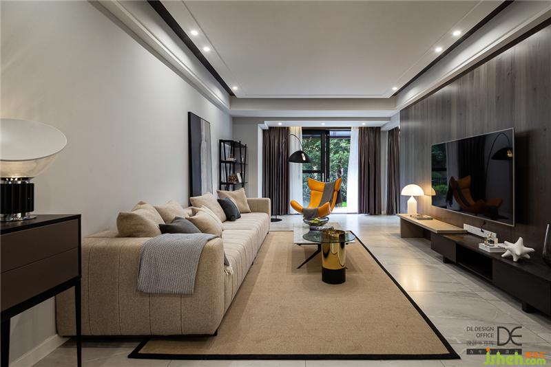 超长客厅空间,简洁的色块与朴实的材质及现代家私的组合,显现出现代空间简洁安静的氛围。当家人在其中穿行停留时,家人成为了空间的主角,空间承载着家人之间的互动。