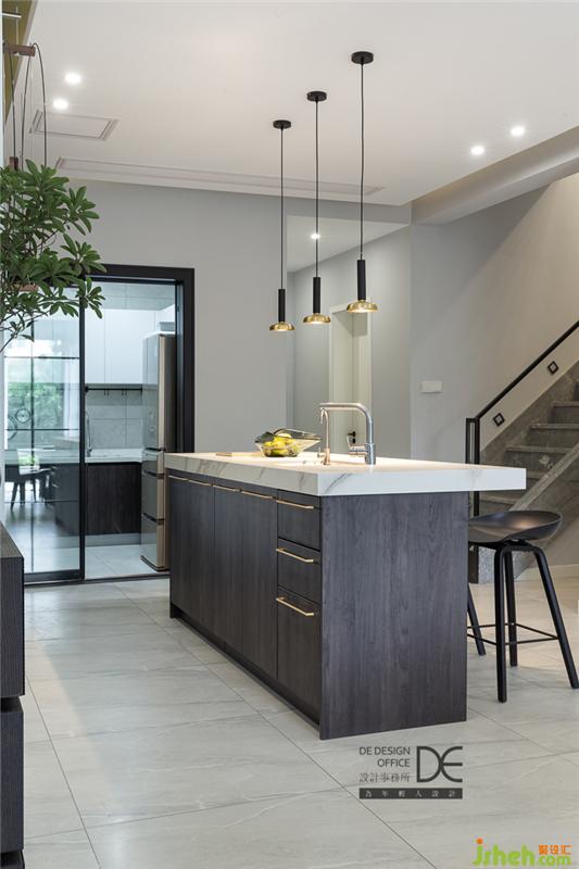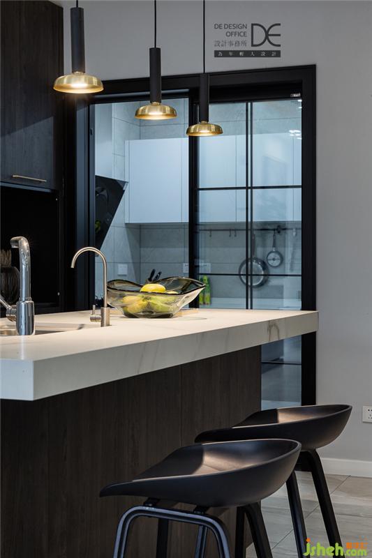 娟姐先生对设计师提出的唯一要求就是餐厨空间要满足川菜制作条件和朋友间美食互动的条件。老薛将中厨空间+西厨空间+餐厅空间一字排开,完美满足了男业主的需求。