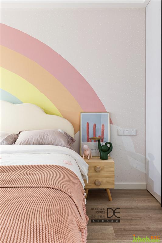 小公主的儿童房以灰色与粉色的搭配为主,同时预留了多个区域,满足小朋友不同阶段的不同需要,七色彩虹的床头背景描绘出小朋友天真浪漫的童年时光。