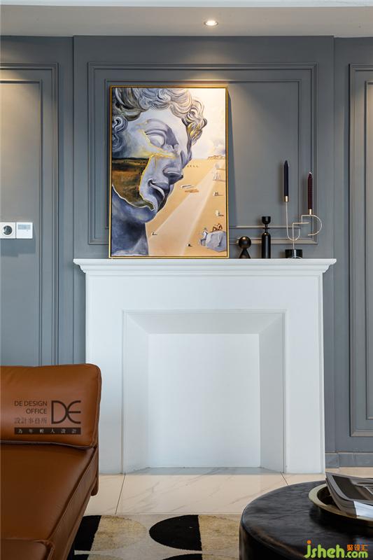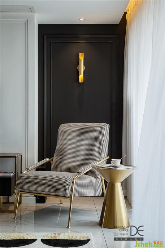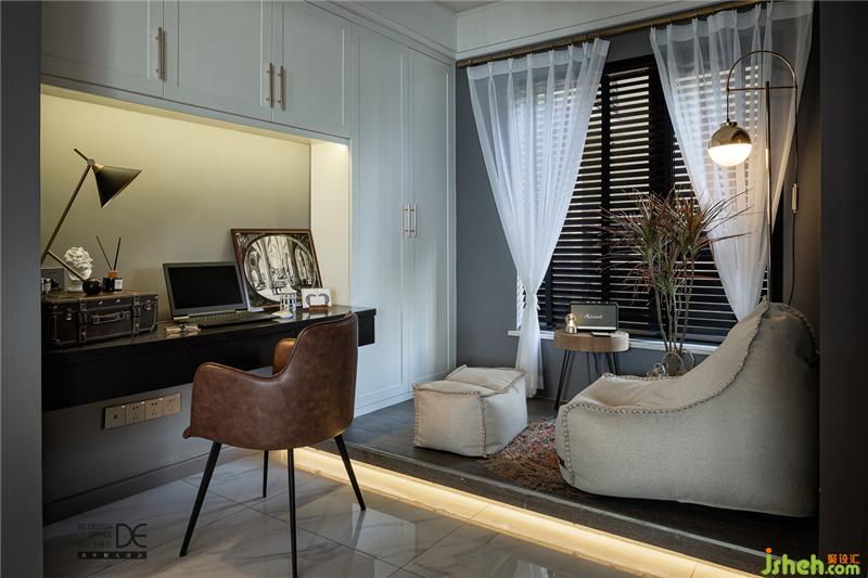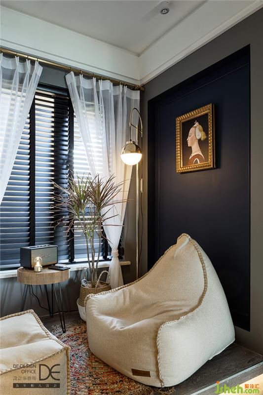 休闲角落以深蓝色和灰色为主调,落地灯柔和的光,加上百叶窗透出的丝丝光线,让人只想在这里听着音乐喝着咖啡,安安静静地享受精致的下午时光。