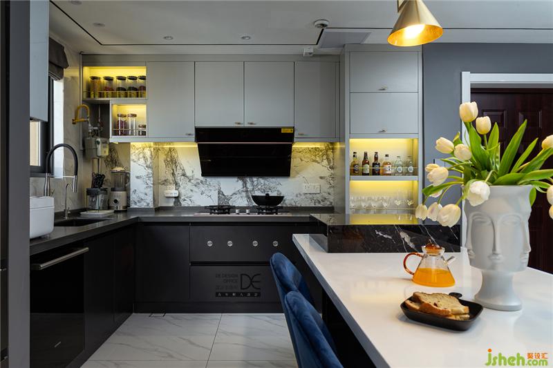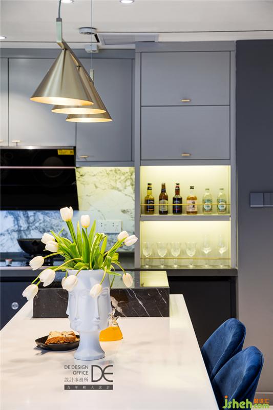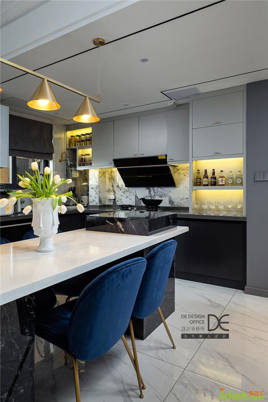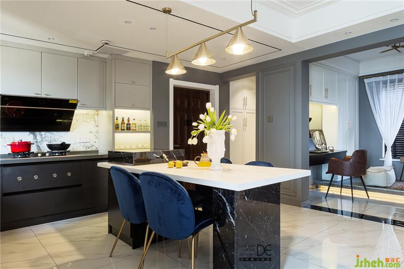 岛台和餐桌结合,黑色石材和白色石材相碰撞,配上蓝色丝绒餐椅,让餐厅既丰富多彩又恰到好处,就想和你在这里共进晚餐。