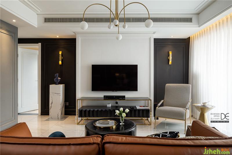 整个客餐厅由大色块组成,客厅的颜色是比较跳跃的,黑白灰墙面的穿插,墙面线条和顶面线条的交相呼应,让整个空间多了几分层次感。