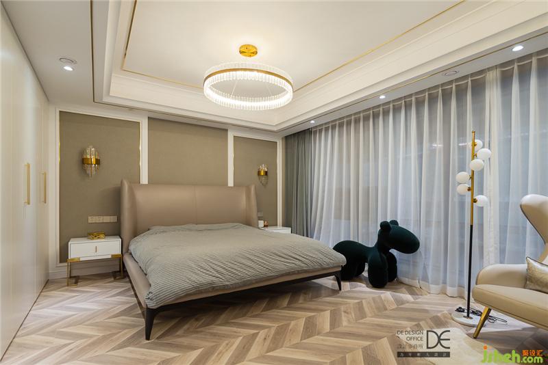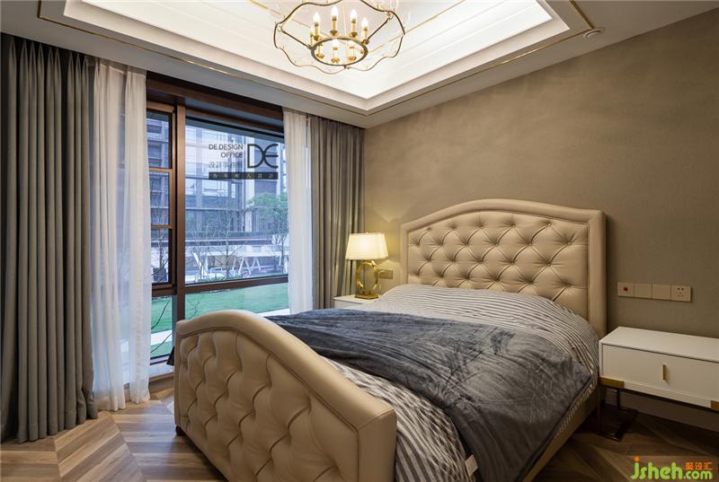 次卧多是老人过来时使用,所以重庆装修设计师选择了偏稳重的主色调,大面的落地窗与精致的灯具为老人营造了一个舒适的睡眠空间。