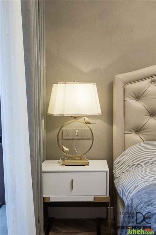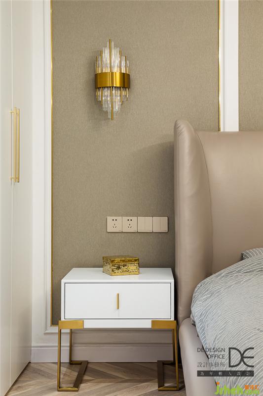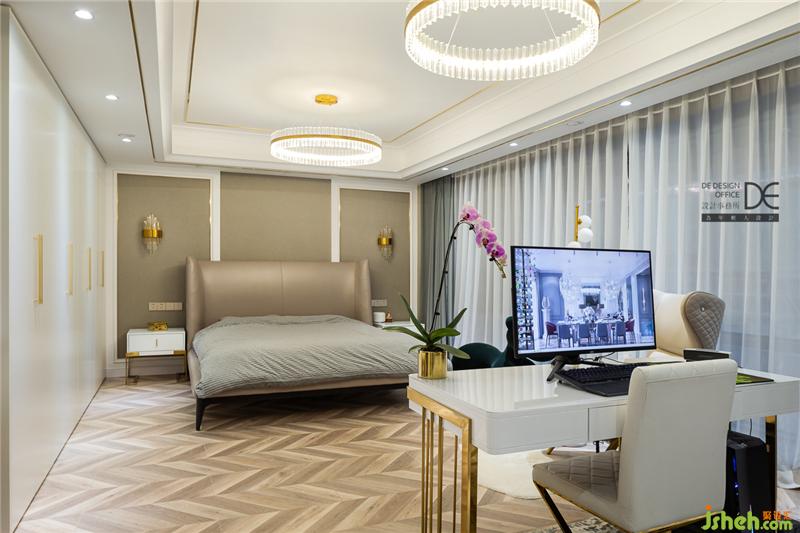 主卧应业主能够“劳逸结合”的要求。床头对称安置金属元素壁灯,整壁柜体和大面窗户彰显休闲大气;补充书房功能,方便业主及时处理工作事务。