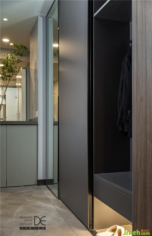 入户门厅为一个换鞋凳+鞋柜+穿衣镜的设计,重庆室内设计师将穿衣镜做了滑门,靠近门口的地方保留了换鞋凳区域,上方设置挂衣区,满足储物需求的同时也方便出入。