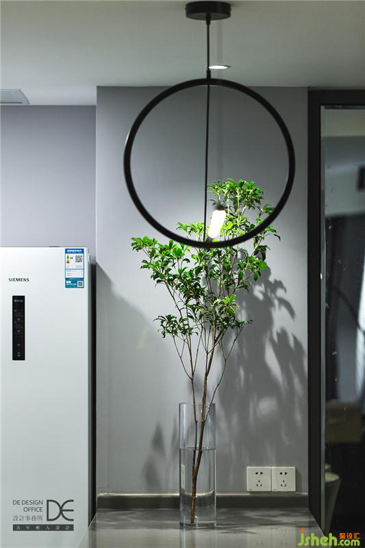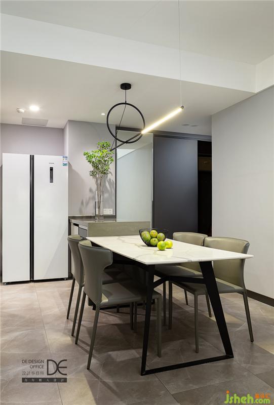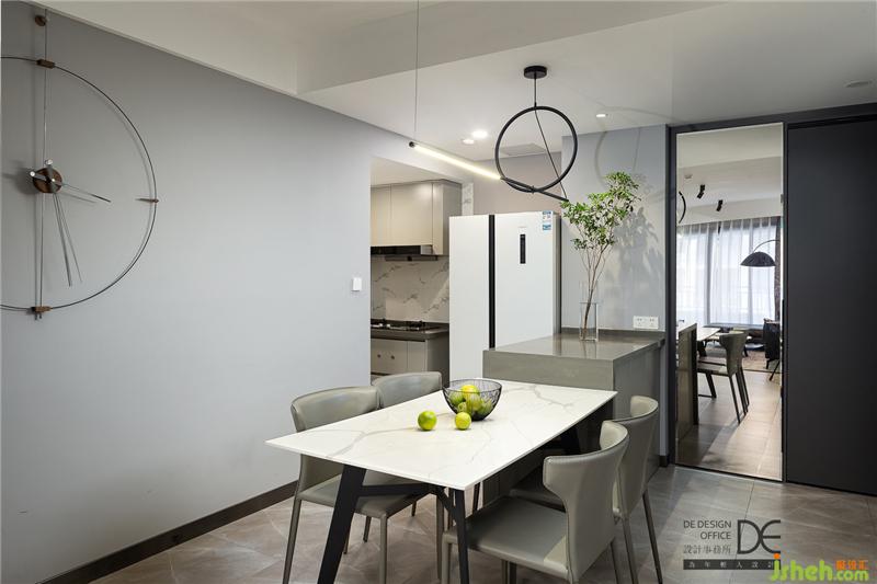 进门后便是餐厨空间,重庆室内设计师餐厅主打灰色调,挂上一个铁艺圈架的时钟,简约之感扑面而来。
