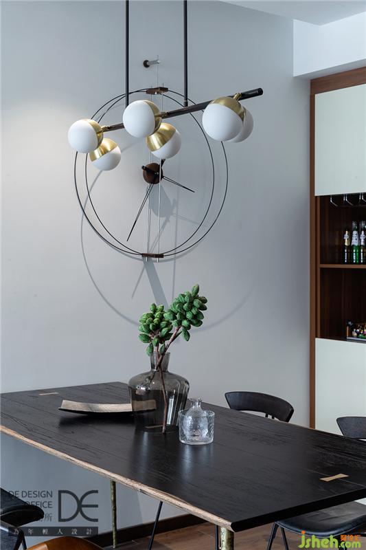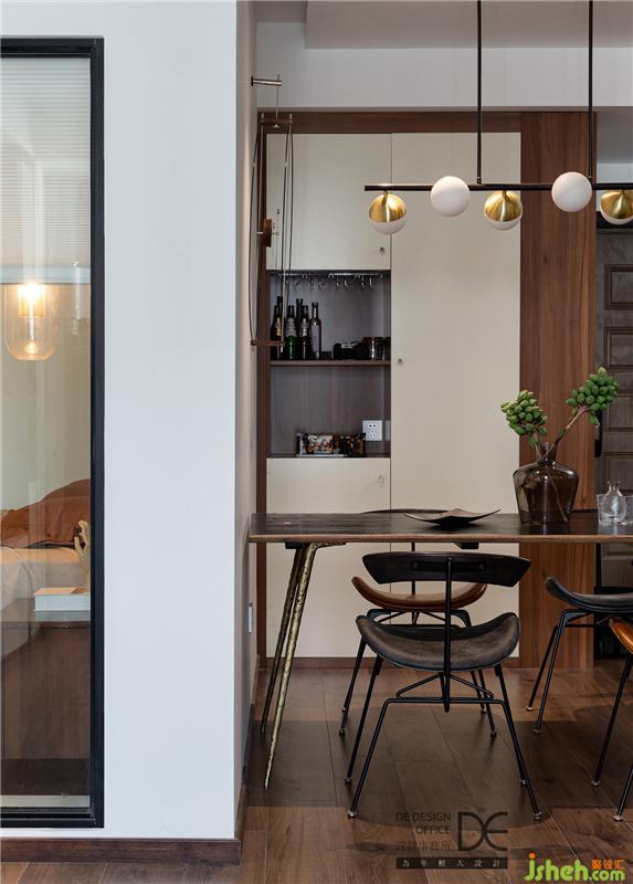 重庆室内设计师选用白色打底,铺上与家具类似的黑胡桃木色地板,做旧的餐桌为这个空间带来一丝复古气息。