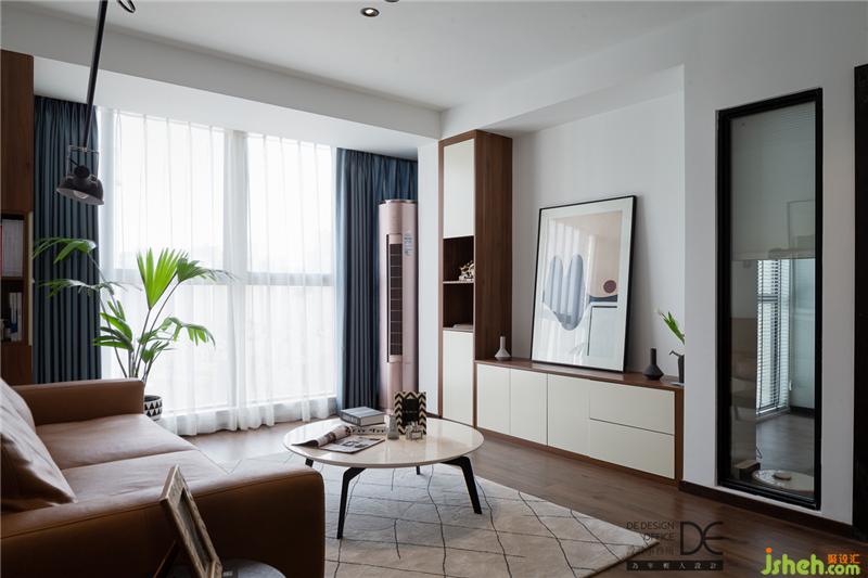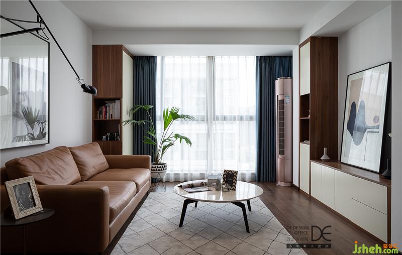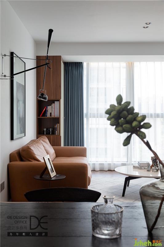 暗橙色的沙发是业主的心头好,旁边的柜体开口部分正好可以作为沙发旁的边几使用,方便业主在沙发上也能随手放置和拿取书籍物件。