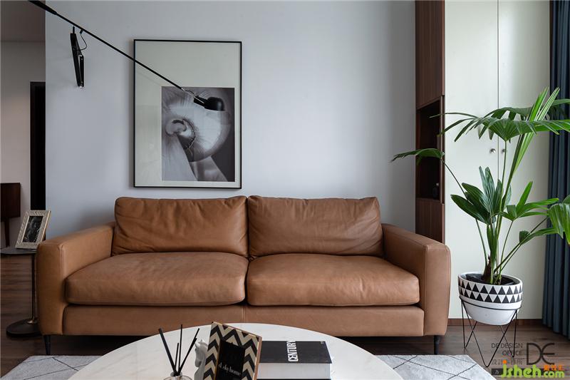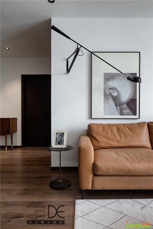 客厅大面积平顶加上点光源设计,配合墙上的摇臂灯,顶上的暗藏灯带,让空间的光线更有层次。墙面没有设计复杂的造型,而是以简单的家具加以衬托,构建了一个安静和谐的画面。