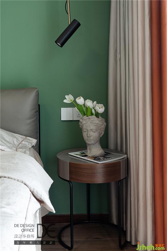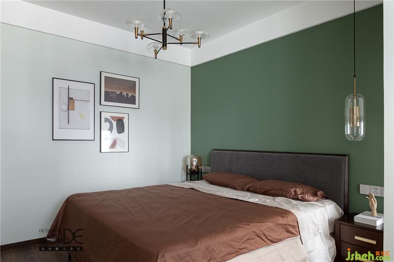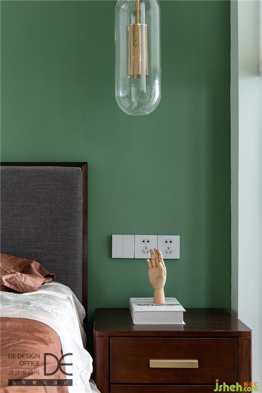 主卧主打复古调的绿色,玻璃金属质感的床头灯与主灯相呼应,营造精致而不失梦幻的睡眠空间。