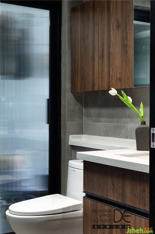 卫浴空间紧凑实用,与厨房相呼应的柜体丰富了储物空间,连通生活阳台的滑门设计增加了空间的通透感。
