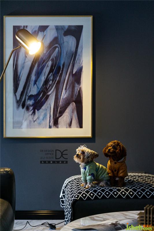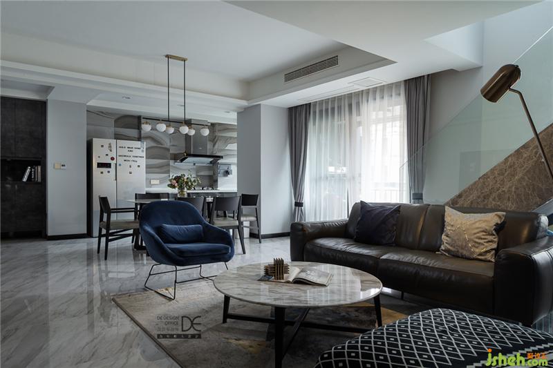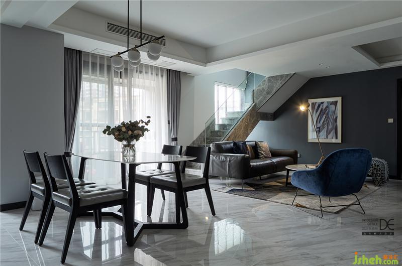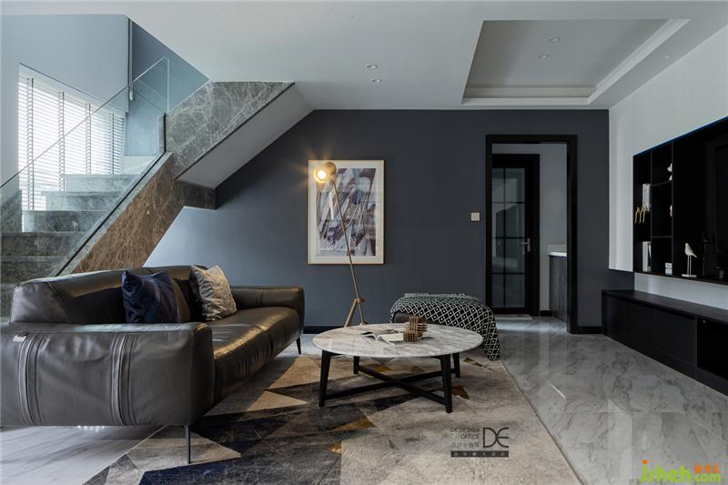 宽敞的简约风客厅,摆上深色沙发、大理石茶几、抽象挂画、金属落地灯……设计师用最简单的元素,塑造一种柔和、平静、稳重的视觉感受。楼梯间引入的光影,更是让整个空间豁然开朗起来。