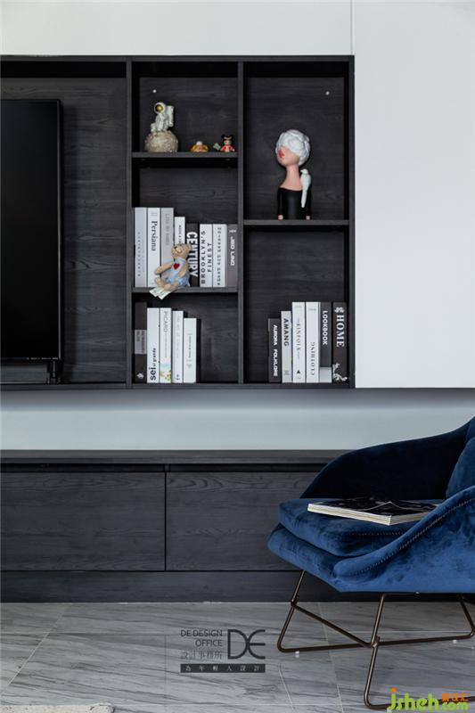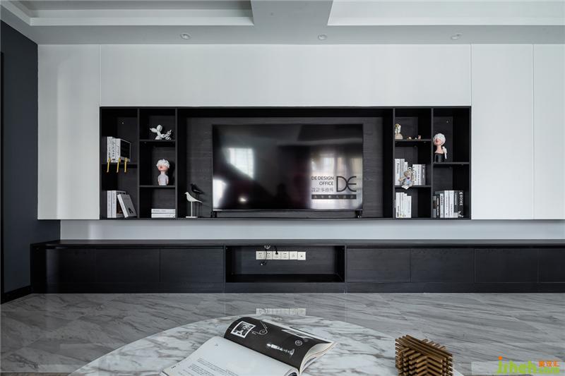 电视背景墙选择了“白+黑”的色彩搭配,提升空间的高级感。同时,设计师用整墙壁柜,弥补了储物空间的不足。