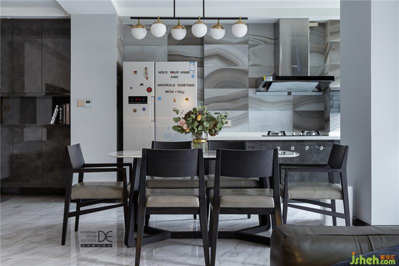 重庆室内设计师打通厨房、餐厅和客厅,让三个区域的使用功能得以穿插结合。开放式的厨房,让业主在享受烹饪时光的同时,也能很好地与家人互动。最平淡而又最浪漫的事,莫过于下班后两人一起下厨,饭后和狗狗们一起在沙发上嬉笑打闹。
