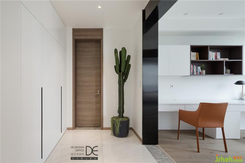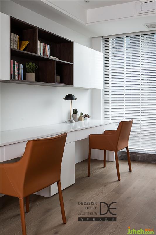 开放式书房位于二层空间,大面积的白色与过道的整面橱柜相呼应,清新绿植、实用双人桌、复古色单椅等元素相结合,落落大方之余,实用而耐看,营造了满满的惬意感。