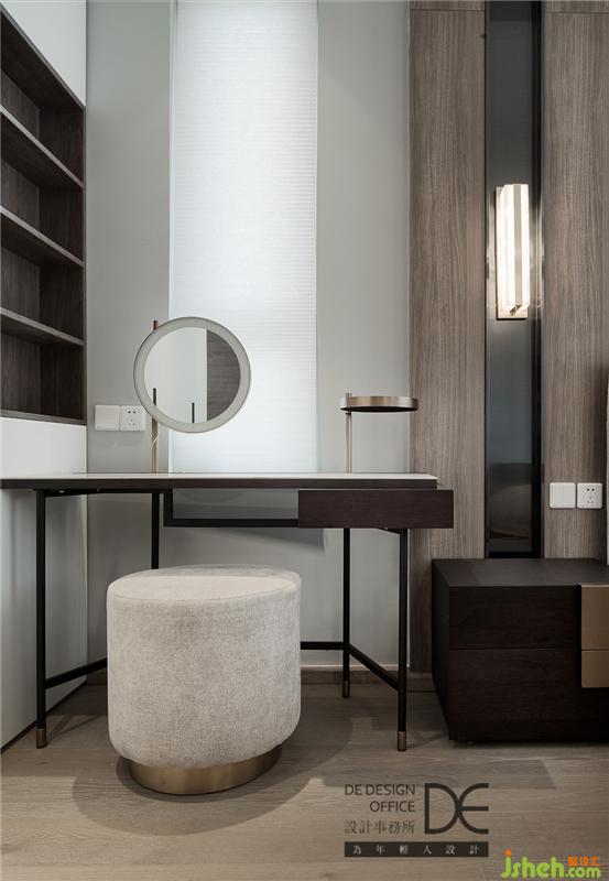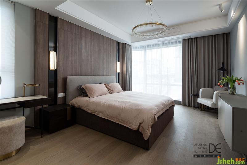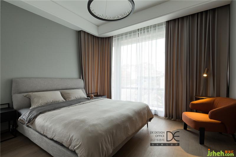主卧延续了公共空间的黑白灰色调,自然格调的木饰面作为背景,与窗帘相呼应,呈现出一个简单而不失质感的睡眠空间。