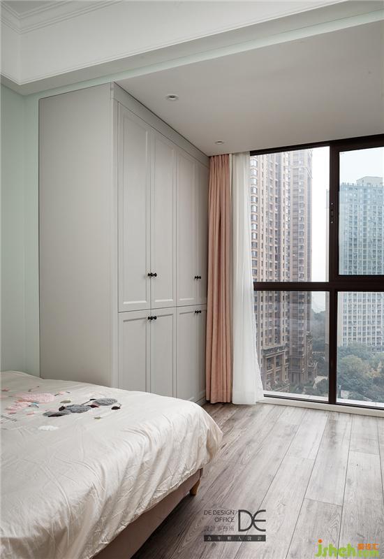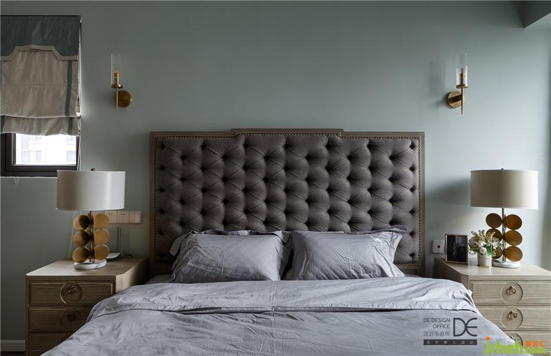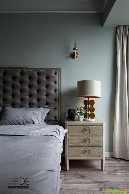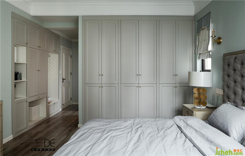 主卧延续客厅的色调,暖灰色衣柜和绿灰色墙面让整个空间放松舒适,浅色元素的组合搭配,为业主营造了一个柔和的睡眠空间。