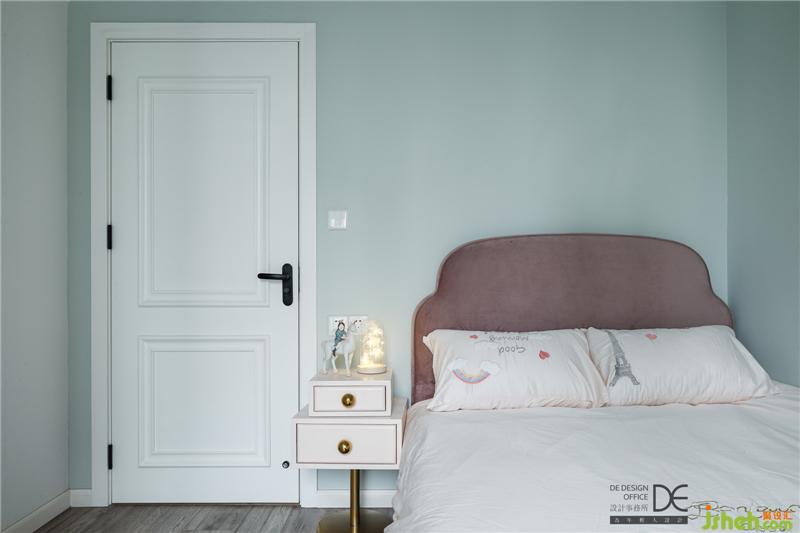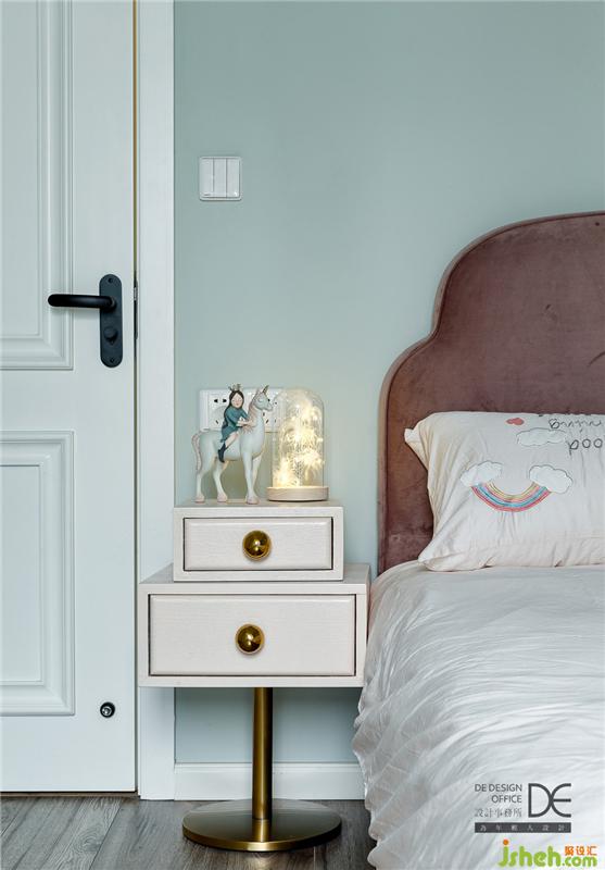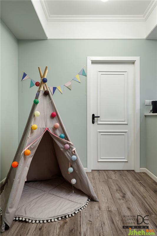 女儿房的色彩温馨舒适,灰绿色、灰粉色和灰色的组合,给人淡淡的安宁感。原始阳台的部分空间也纳入了女儿房,采光得到更好地提升。落地窗视野极好,为小朋友营造了一个舒适自然的成长环境。