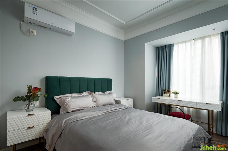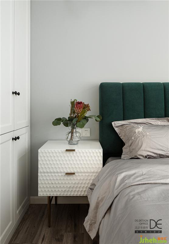 次卧的色彩相对跳跃一些,灰色和墨绿色的碰撞,让空间多了几分层次。在典雅气息的空间里,梦也格外美好。