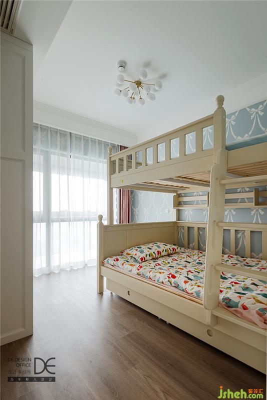 儿童房清雅温馨,蝴蝶结背景赋予了小女孩柔软的公主梦。窗户做了大面玻璃,拉上窗帘,是隐秘的个人空间;拉开窗帘,也可以与外阳台进行很好的互动。