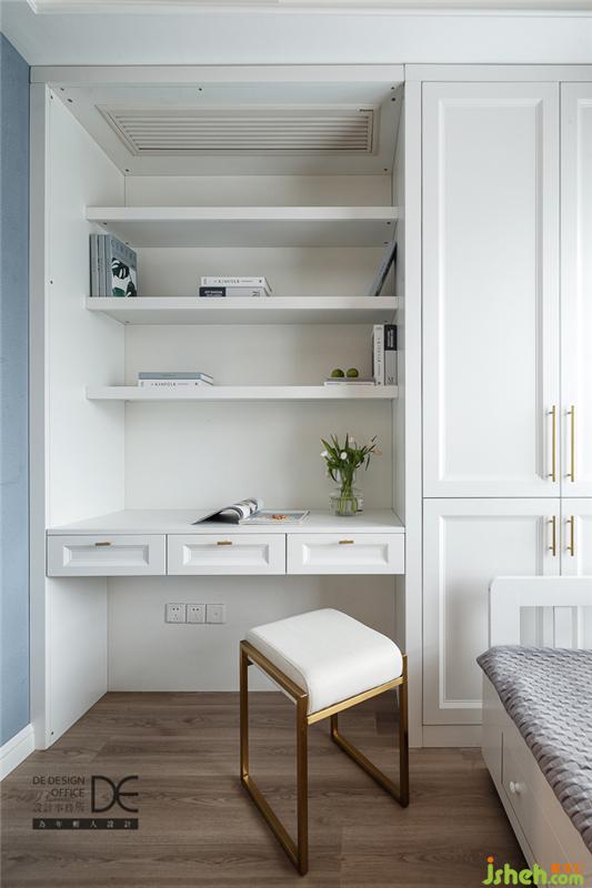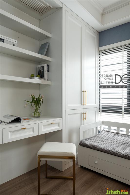 书房主打白色调,加以部分蓝色点缀,清新整洁。榻榻米与书柜、书桌的结合,让房间功能变得丰富,集储物收纳、学习办公、休息睡眠为一体。