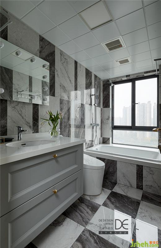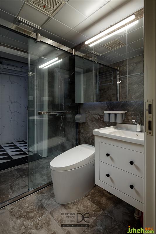 主卫、次卧均主打黑白灰色调,拼色的大理石纹路墙地面,精致而有趣,无形中提升着空间质感。