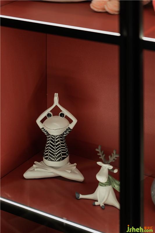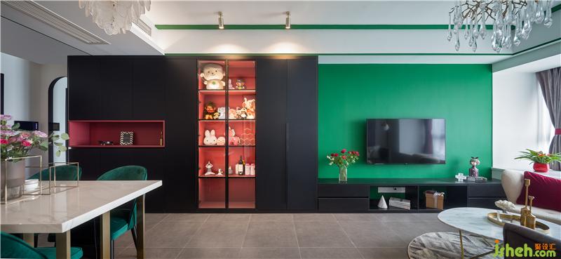 客厅红色+黑色的柜体与绿色的电视背景墙形成鲜明对比。在很多人的认知中,红色与绿色的搭配总有一种俗不可耐的味道,然而红配绿又是自然界最普遍的组合,一个鲜艳且热烈,一个流淌着生命力~