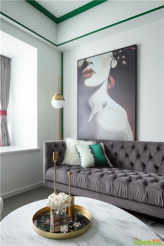 哑光浅灰地砖通铺了厨房客餐厅,干净利落的空间摆上一块小巧的地毯,与圆形小茶几相呼应,布置上灰色布面沙发,HOLD住客厅大面积的绿色。沙发背景墙以挂画和落地灯结合的方式,呈现出一种高级的精致感。