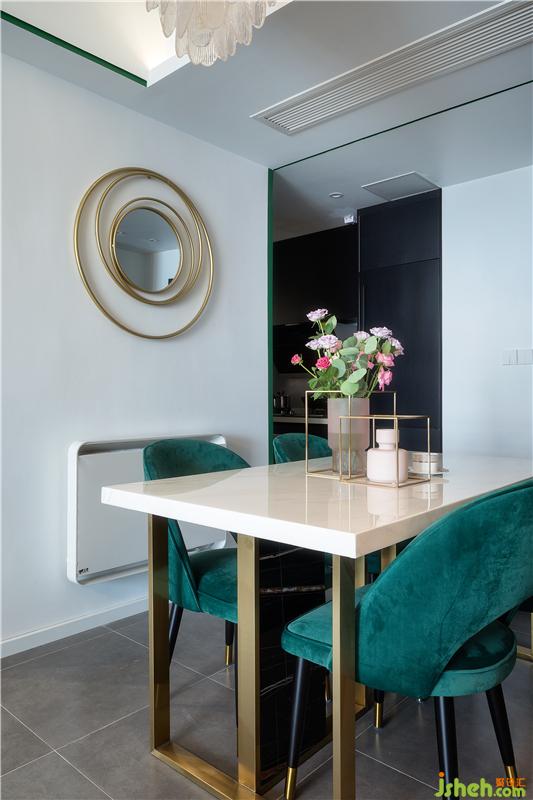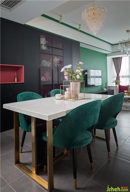 餐厅与客厅连通的格局,让空间显得敞亮。金属点缀的餐桌搭配墨绿色的餐椅,布置上精致的花瓶,让用餐氛围显得颇有情趣。