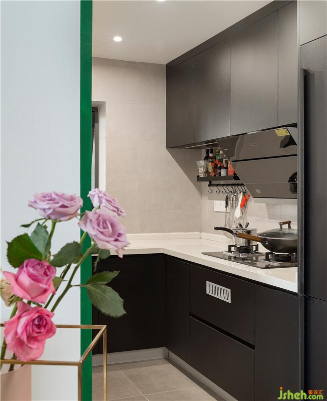 一个人的厨房也要足够精致,嵌入式冰箱隐藏在黑色橱柜中,厨房的颜值得以进一步提升,烹饪成为一种享受。