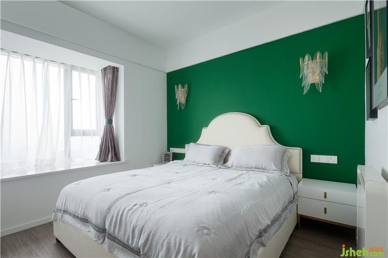 卧室延续客厅的绿色调,搭配白色大床和柜体,整个睡眠空间清新舒适,彰显着如春天般的生机与活力。
